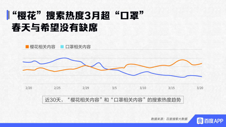 报告显示,“樱花”相关内容搜索热度在3月超过“口罩”,“武大樱花”、“武汉东湖樱园”频上热搜,人们通过“云赏花”的方式,了解着武汉樱花美景。这也反映出人们心态更加积极,在这座英雄的城市,春天与希望没有缺席。