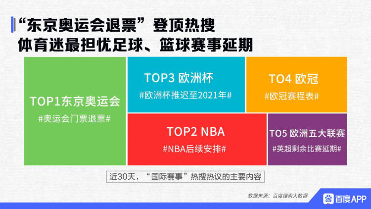 2月24日,国际奥委会和东京奥组委发表联合声明,东京奥运会推迟至2021年举办。疫情蔓延态势不减,让许多国际赛事不得不延期举行。报告指出,近30天,“国际赛事”热搜热议内容中,东京奥运会热度最高,延期的决定公布后,“奥运会门票退票”也成为许多人的困扰。而足球、篮球赛事的延期得到了网民更多的关注。