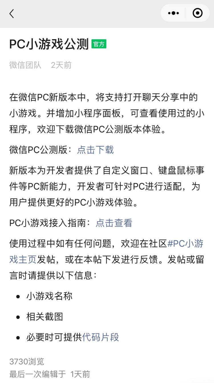 对此,微信开发团队官方发布了PC小游戏公测:在微信PC新版本中,将支持打开聊天分享中的小游戏。而PC小游戏接入指南也显示,