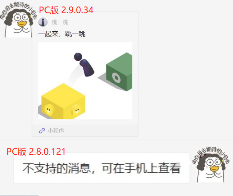 周到君用微信自己的小游戏“跳一跳”做了个测试。在 2.9.0 测试版中,可打开小游戏,且和手机端的显示和玩法无差别。而PC版本为 2.8.0.121 的,则只能打开除小游戏以外的小程序。