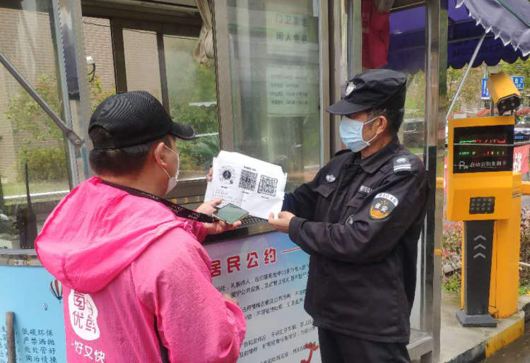 3月23日,社区根据市里相关要求,对快递和外卖进行有条件进入,对外卖快递人员发放出入证,验证绿码,信息登记后进入社区配送,出社区归还出入证,便于管理及后续追踪。