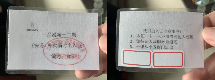记者注意到,在临时出入证的背面有两个白色的空格,“前面填写的是公司名称,后面是人员姓名。”物业经理解释道。只有在快递员、外卖员测量体温并具备随申码、临时出入证后,方可进入小区。