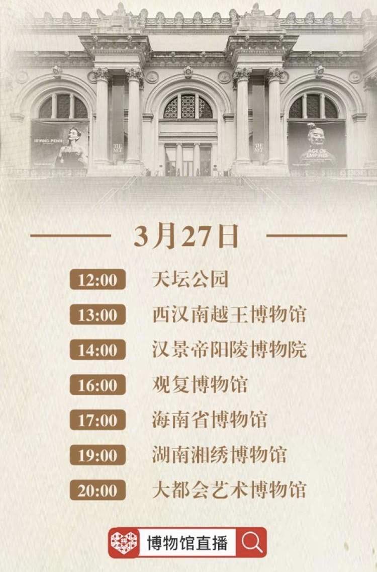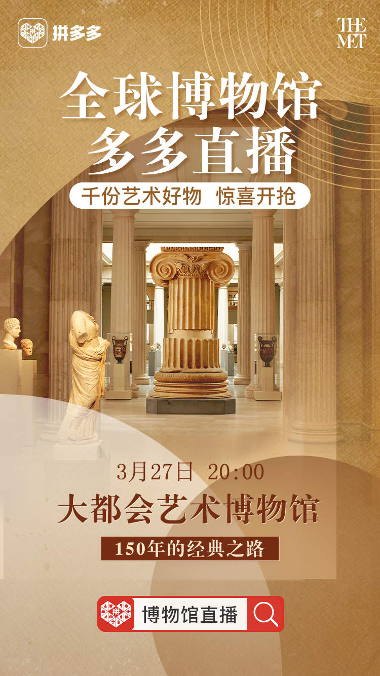 3月27日,大都会艺术博物馆、汉景帝阳陵博物院、海南省博物馆、西汉南越王博物馆等全球七所顶级博物馆,将在拼多多开启直播,并上线销售近千种博物馆特色精华周边,这些文创产品将在直播间内以最优惠价格供应给消费者。