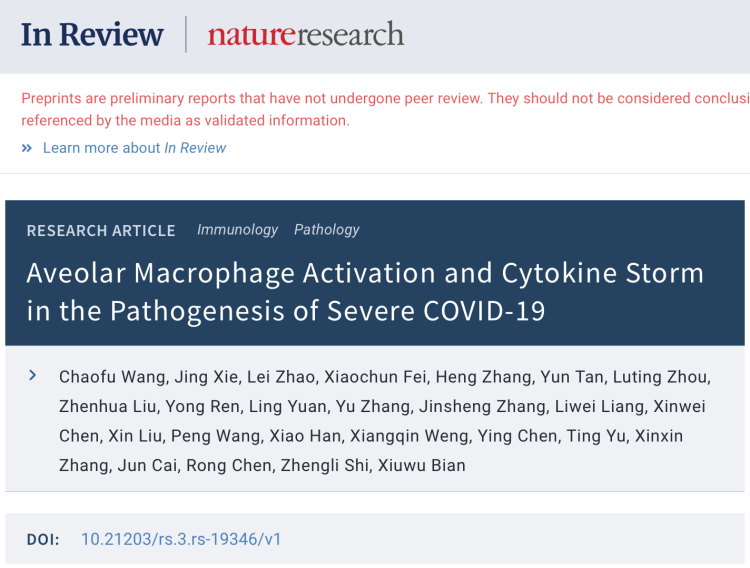 3月25日,上海交通大学医学院附属瑞金医院病理科王朝夫教授研究团队在Springer Nature主办的Research Square平台以预印论文的形式公布了正在Nature杂志审稿的研究“Aveolar Macrophage Activation and Cytokine Storm in the Pathogenesis of Severe COVID-19”,报道了严重新冠肺炎的病理解剖研究成果。