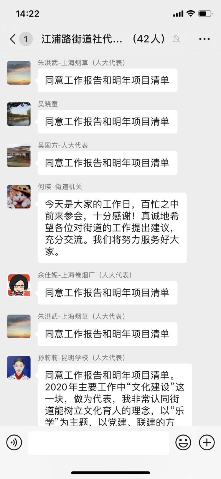 一年一度的社区代表大会是推动社区共建共治共享的重要平台,是社区推动民主协商、民主治理、民主决策、民主监督的有效形式。江浦路街道在特殊时期运用特殊方式进行“云会议”尚属街道首次。会议前一天(3月26日),各个微信群召集人邀请社区代表加入微信群,并完成实名制昵称。3月27日一早,各居民区代表佩戴口罩,到达指定地点,在微信群内签到后会议正式开始。