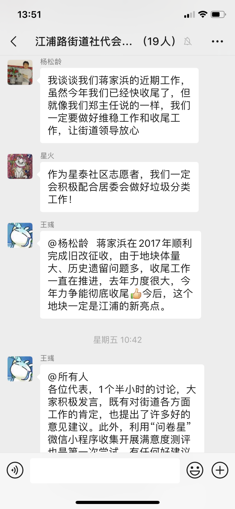”我谈谈我们蒋家浜的近期工作,虽然今年已经快收尾了,但就像我们郑主任说的一样,一定要做好维稳工作和收尾工作,让街道领导放心。““蒋家浜在2017年顺利完成旧改征收,由于历史遗留问题多,收尾工作一直在推进,今年力争能彻底收尾。“这是来自“江浦路街道社代会第一组”微信群内的一段对话。蒋家浜居民区党总支负责人杨松龄在发言不久后,江浦路街道社区党建办公室副主任王彧很快便在微信群内回复了他。