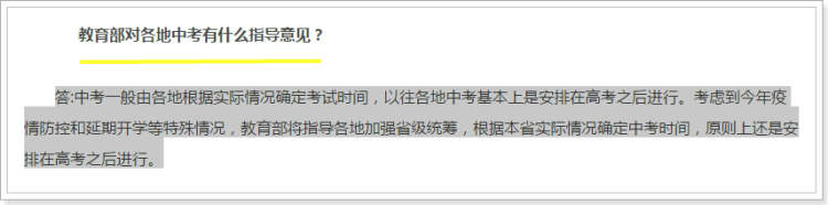 教育部表示,中考一般由各地根据实际情况确定考试时间,以往各地中考基本上是安排在高考之后进行。考虑到今年疫情防控和延期开学等特殊情况,教育部将指导各地加强省级统筹,根据本省实际情况确定中考时间,原则上还是安排在高考之后进行。