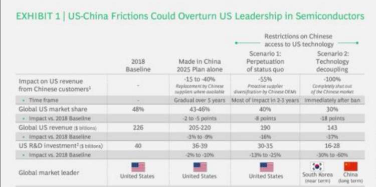 BCG表示,如果美国完全禁止半导体公司向中国客户出售产品,那么美国公司在全球市场份额将损失18个百分点的市场,其收入将损失37%,并在美国半导体行业中损失15000至40000个高技能直接工作。