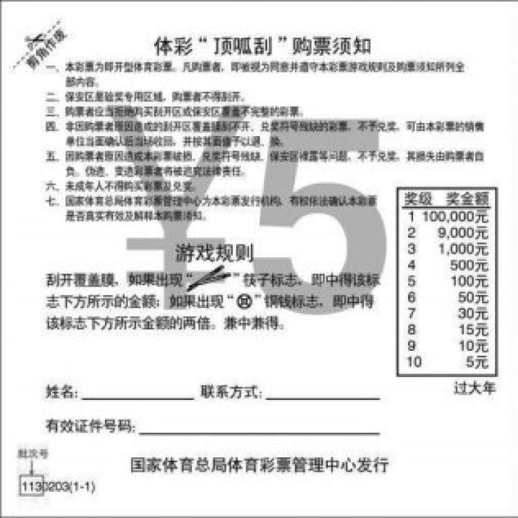 同时,国家体彩中心还发布了《关于停止销售在售即开型体育彩票游戏中2015年(含)前印制的各批次彩票的公告》,在全国范围停止销售即开型体育彩票游戏中2015年(含)前印制的各批次彩票,具体印刷批次号是7位数字的顶呱刮即开型体育彩票:前三位为“108”、“109”、“110”、“111”、“112”、“113”、“114”、“115”;印刷批次号是9位数字的即开型体育彩票:前五位为“12008”、“12009”、“12010”、“12011”、“12012”、“12013”、“12014”、“12015”(印刷批次号见票背左下角,位置如图所示):