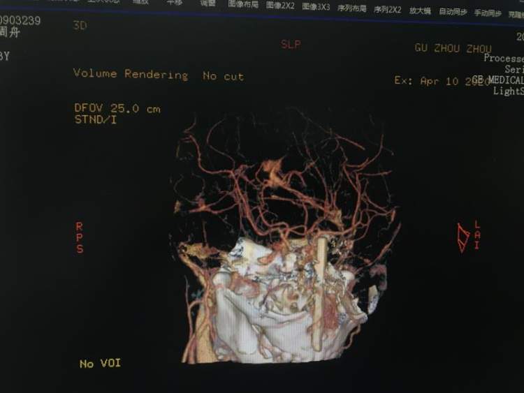 儿童医院神经外科、耳鼻喉头颈外科联合影像科紧急会诊。通过头部CT及CTA血管造影发现,折断的筷子已经插入浩浩颅内五厘米深,而且位置十分凶险:右侧就是眼球,左侧是大脑前动脉,四周都是重要的结构,可谓“步步惊心”。