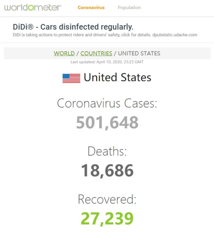 据worldometers网站全球实时统计显示,截至北京时间4月11日7时20分,美国新冠肺炎确诊病例突破50万例,达到501648例,累计死亡18686例,累计治愈27239例。