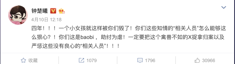 钟楚曦发文说:四年!!!一个小女孩就这样被你们毁了!你们这些知情的“相关人员”怎么能够这么狠心?!你们这是baobi ,助纣为虐!一定要把这个禽兽不如的X捉拿归案以及严惩这些没有良心的“相关人员”!!!