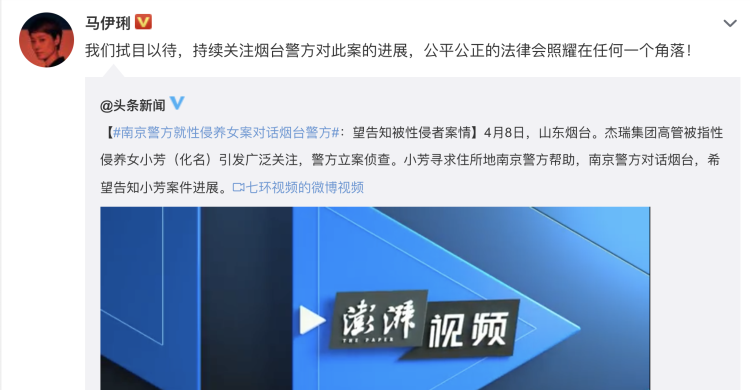 马伊琍发文说:我们拭目以待,持续关注烟台警方对此案的进展,公平公正的法律会照耀在任何一个角落!