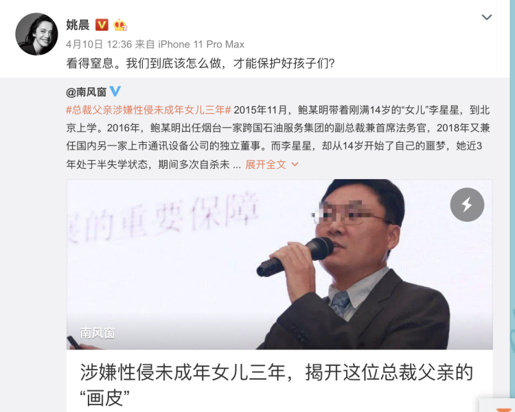 姚晨连发三条微博:看得窒息。我们到底该怎么做,才能保护好孩子们?