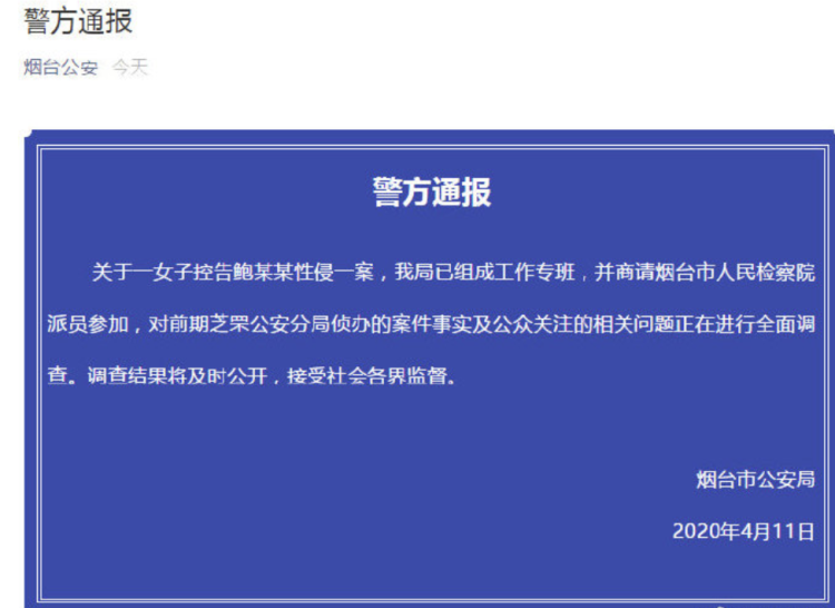 今天早上,烟台警方组成工作专班,调查"高管被指控性侵养女"案,并对前期芝罘公安分局侦办的案件事实及公众关注的相关问题进行全面调查。调查结果将及时公开,接受社会各界监督。