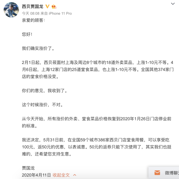 复工复市阶段,一些餐饮品牌近期涨价惹争议。继昨天海底捞为涨价道歉宣布恢复停业前价格后,今天,西贝莜面村董事长贾国龙也在其个人微博承认涨价,并表示“这个时候涨价,不对。”