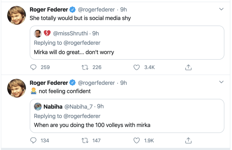 球迷们表现出好奇之后,@费德勒问道:“你什么时候和米尔卡一起进行100次对截?” 费德勒回答说:“不自信”。另一位粉丝则表示:“米尔卡会做得很棒的……不用担心。” 费德勒再次表示说:“她完全会,但是对社交媒体感到‘害羞’。”