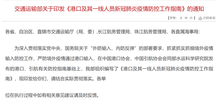《工作指南》指出,进出港口的人员和车辆应由船舶代理等相关单位提前通报,严格执行相关人员进港前的体温检测。禁止体温超过37.3℃的人员进入港口,并按照程序上报当地卫生健康管理部门。