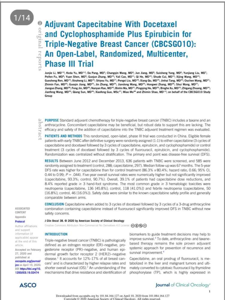 如今,这项联合卡培他滨辅助化疗的三阴性乳腺癌治疗“中国方案”是中国乳腺癌辅助治疗研究领域首个刊登在《JCO》具有中国自主知识产权的临床研究,它将在保障患者安全性、耐受性的同时,显著提高三阴性乳腺癌患者预后,未来有望写入治疗指南,成为全球三阴性乳腺癌治疗的标准方案。
