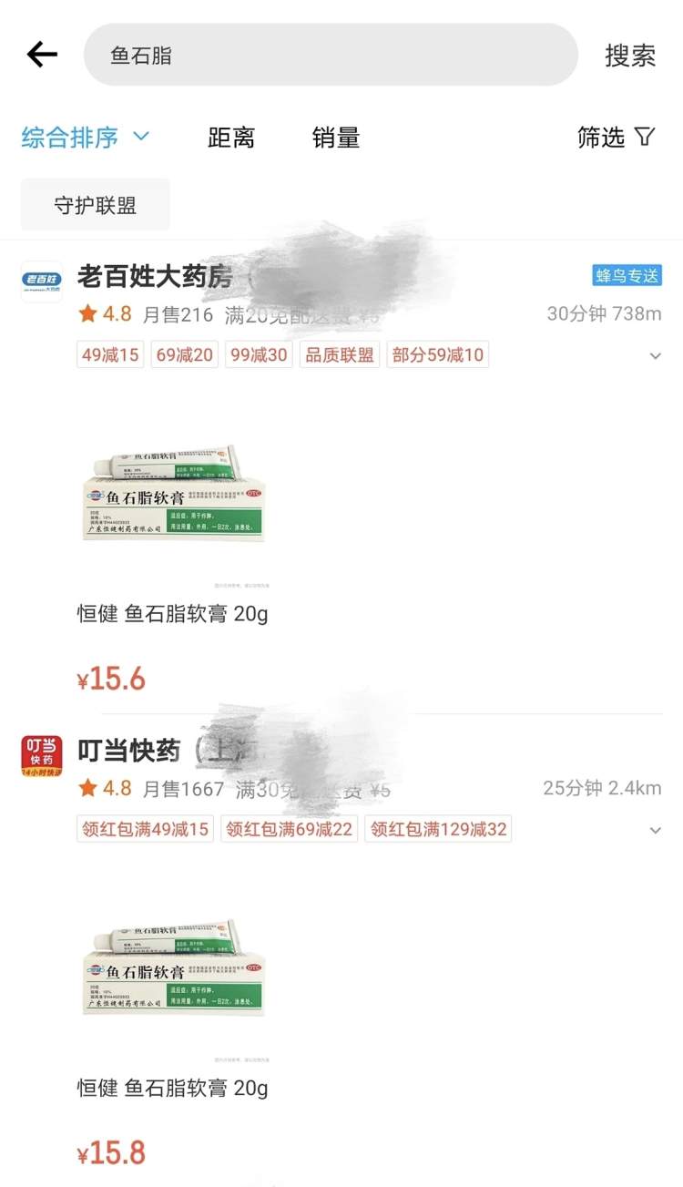 无奈之下,刘女士只好拿着药离开,刚走出药店,刘女士就打开了手机里的外卖平台,查找鱼石脂软膏的价格。