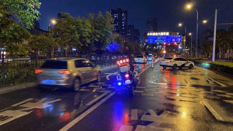 同时,警方通过警用摩托车上的显示器,滚动播放提示信息,提醒广大驾驶员雨天路滑,应减慢车速,注意安全。