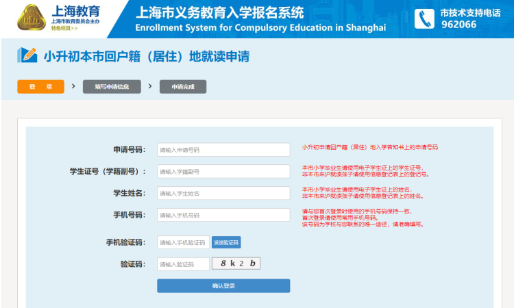填写注意:申请号码——小升初申请回户籍(居住)地入学告知书上的申请号码;