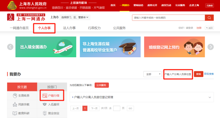 网上办理:登录上海“一网通办”总门户,在腰带“个人社区事务服务”栏,搜索“户籍人户分离人员居住登记受理”,立即办理。