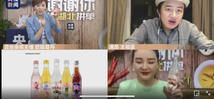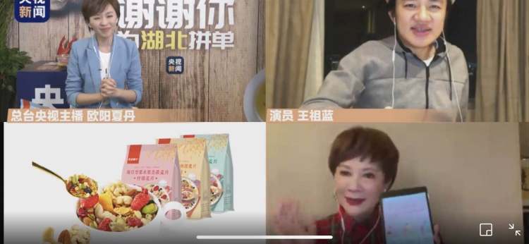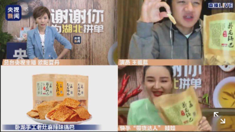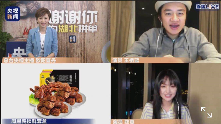 在两个多小时的直播中,央视新闻主播欧阳夏丹携手演员王祖蓝、郑爽、蔡明,通过隔空连线湖北省十堰市副市长王晓以及多位“带货达人”,为12种湖北特产在线吆喝。锅巴、汽水、热干面、玉露茶、红薯粉条……从土特产到小零食,不少明星产品多次“秒光”。