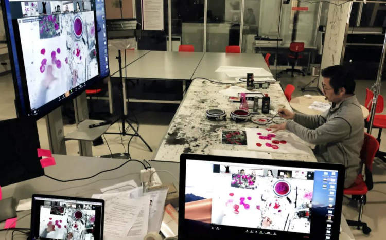 例如,在上纽大艺术学教学副教授Barbara Edelstein和张健君负责执教的“工作室艺术入门与项目”课程中,两位教授为了给在教室上课的3名学生,以及在世界各地远程上课的12名学生讲授这一课程,工作室里布设了三台电脑、两个网络摄像头、一台相机和五面显示屏。