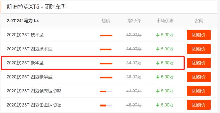 凯迪拉克 XT5 28T豪华型,官方指导价为34.97万元,平台的五五折优惠后,价格为19.2335万元。