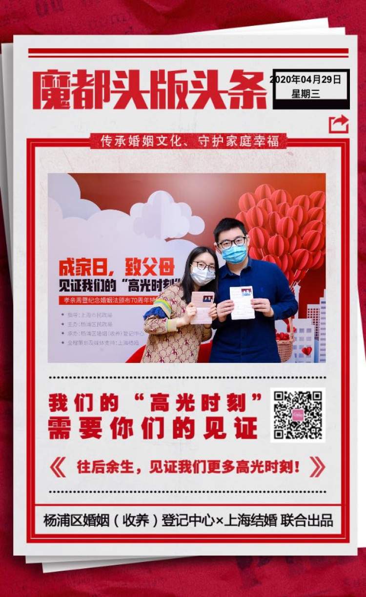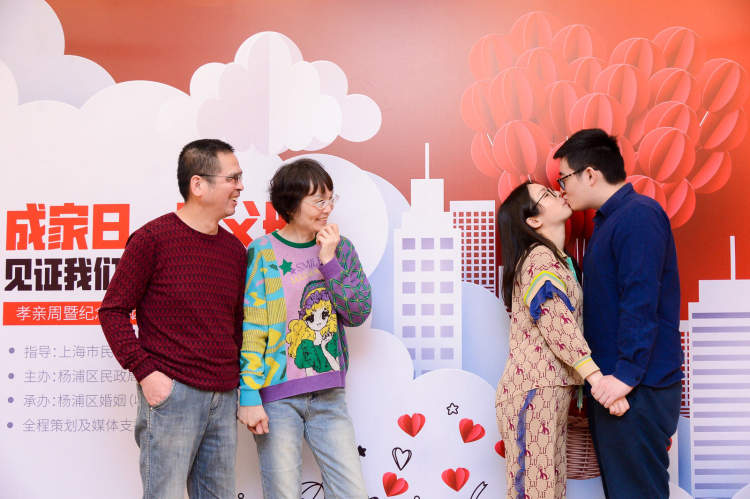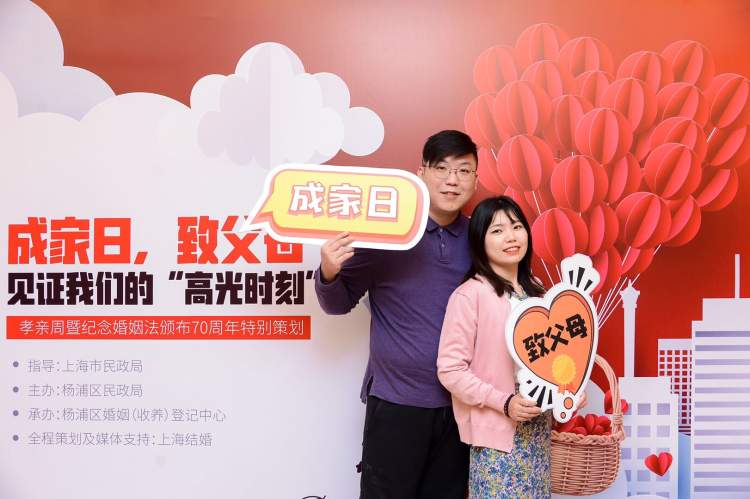 记者了解到,此次活动由上海市民政局婚管处指导,由杨浦区民政局主办,杨浦区婚姻(收养)登记中心承办,从4月27日至5月3日,杨浦区婚姻登记(收养)中心推出孝亲周暨《婚姻法》颁布70周年活动,而今天上午举行的这一特别策划活动“成家日,致父母,见证我们的‘高光时刻’”,更是结合线上与线下,将孝亲周推向高潮。