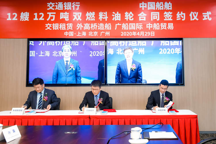 今天(29日),中国船舶集团有限公司旗下中国船舶工业贸易有限公司、上海外高桥造船有限公司、广船国际有限公司与交通银行股份有限公司旗下交银金融租赁有限责任公司在北京、上海、广州三地以“云签约”方式签署12艘12万吨双燃料油船建造合同,合同总金额约46亿元人民币,这是中国船舶集团旗下单位近期承接的又一单笔大额订单。