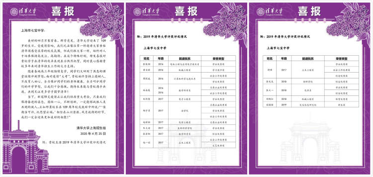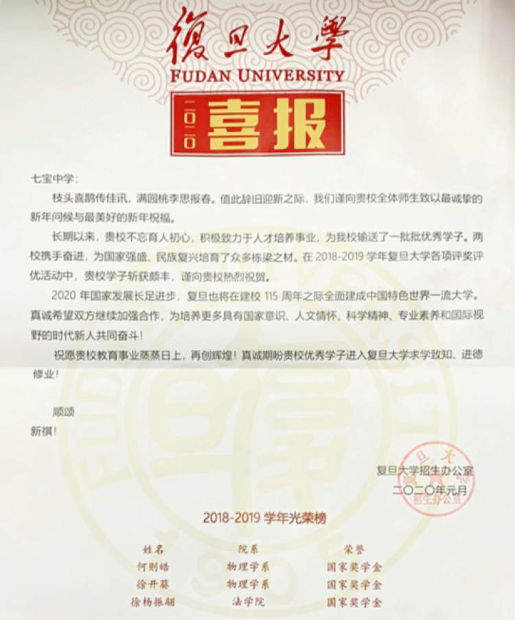 近日,清华大学等国内高水平大学向七宝中学发来喜报,通报七宝中学学子在大学中获奖评优的情况。