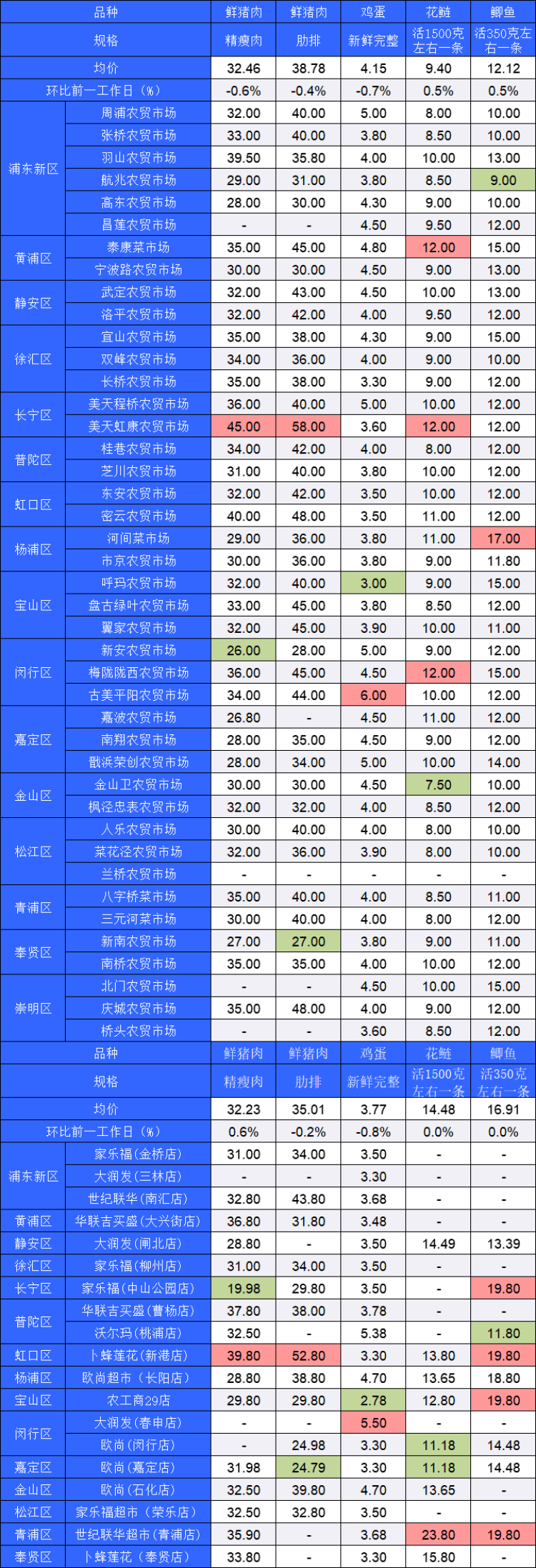 ■粉底标注代表该肉蛋鱼品种在上述农贸市场或超市的最高价;绿底标注代表该肉蛋鱼品种在上述农贸市场或超市的最低价