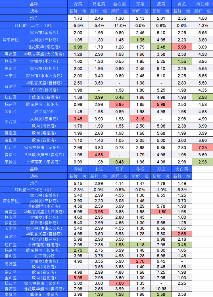 ■粉底标注代表该蔬菜品种在上述农贸市场或超市的最高价;绿底标注代表该蔬菜品种在上述农贸市场或超市的最低价