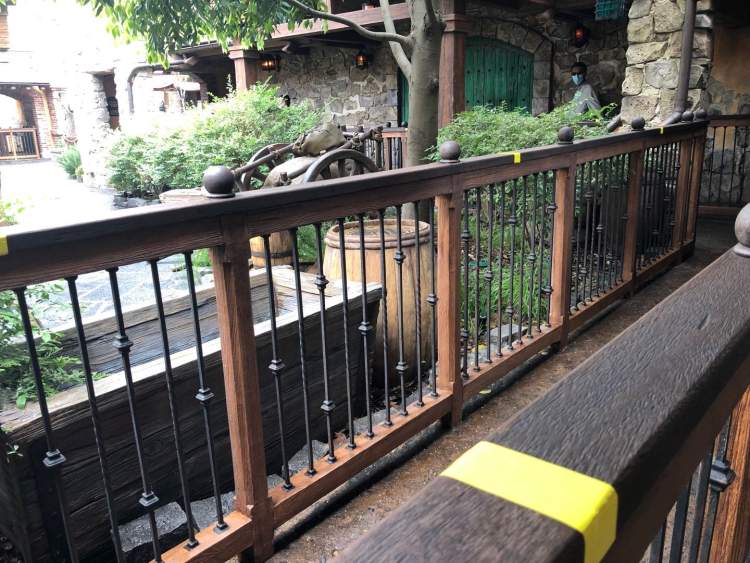 对游客来说,游玩过程中最大的注意事项就是保持适当距离排队。在各景点、小食亭、餐厅、商店收银台、游船座椅等处,都贴上了黄色分隔线,迪士尼演职人员会手举提示牌,提醒游客按黄线规定排队等候,不要聚集。