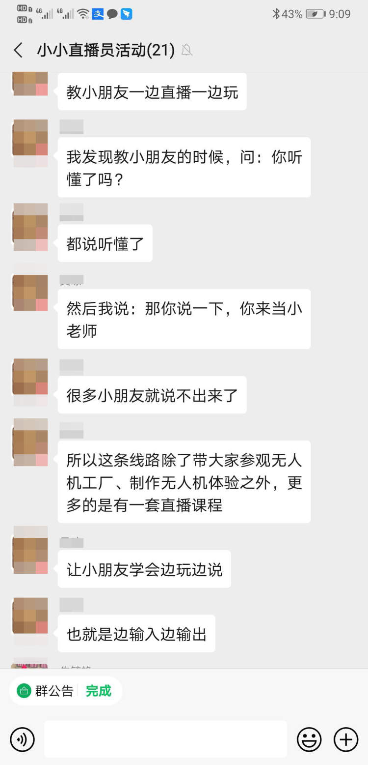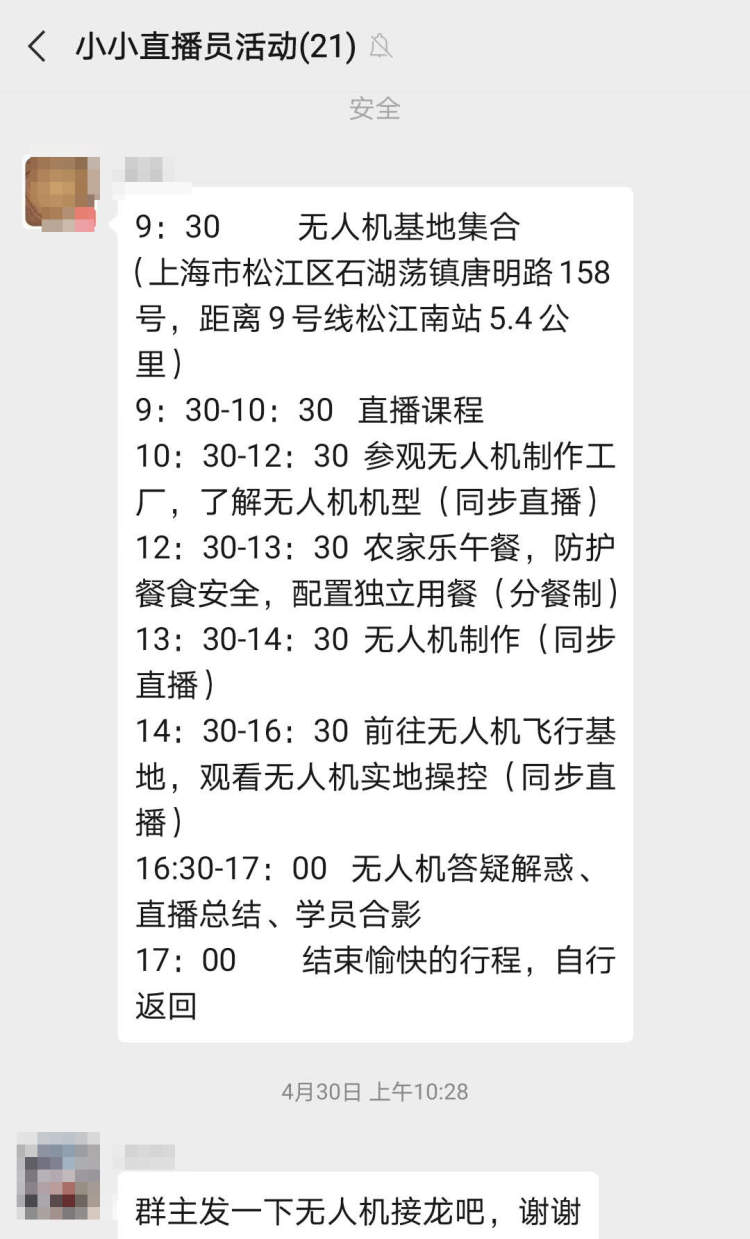 通过宣传单页中的二维码,记者加入到了这个直播活动群中。在活动群中,记者看到,一场名为“无人机‘飞’‘播’体验”的活动正在报名中,截至5月5日活动开始前,有十余组家庭参与到了个这个活动中。