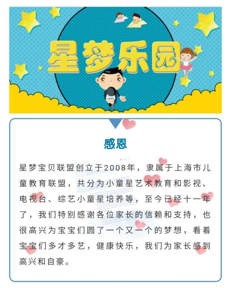 根据公众号“星梦乐园”介绍,“星梦宝贝联盟是一家旨在为孩子铸造星梦乐园的儿童才艺培养机构,机构主营内容为“发掘有潜质和天赋的优秀儿童,提供多渠道的影视、电视台、综艺交流机会”。