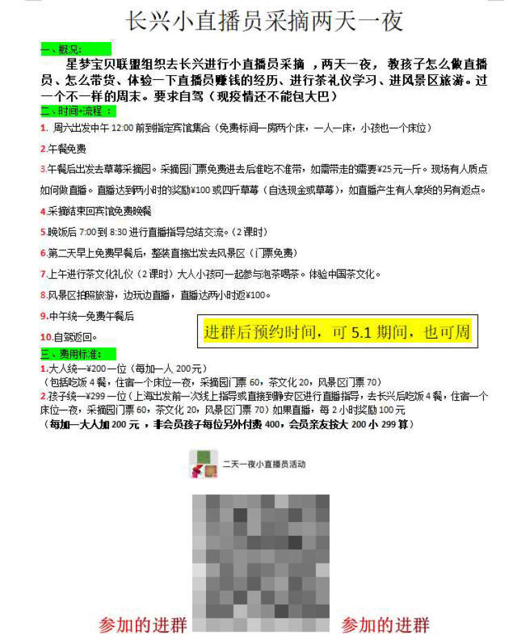 “五一”前夕,明明(化名)妈妈发现,她所在的家长交流群中,出现了一则名为“长兴小直播员采摘两天一夜”的宣传单页。