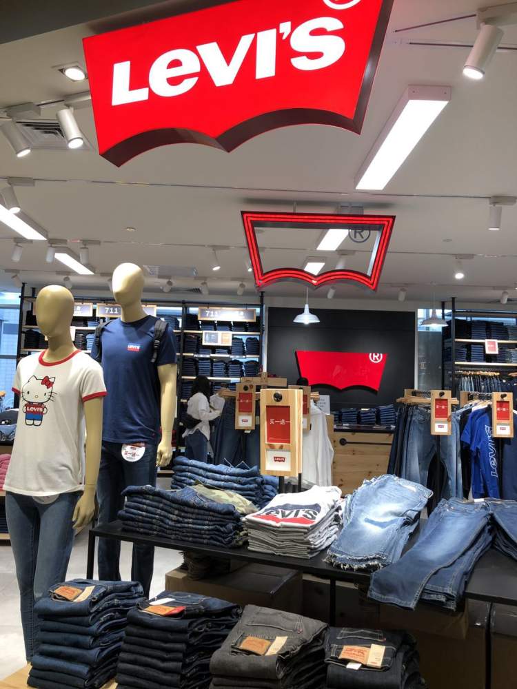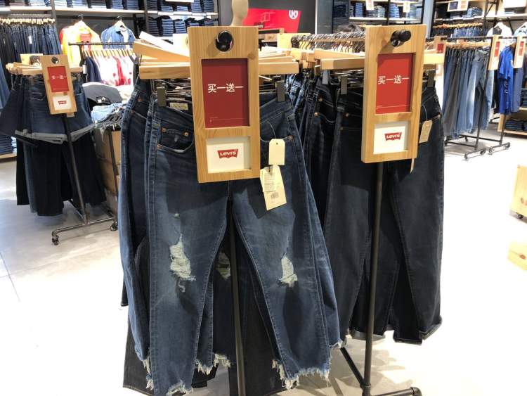 “买一送一”,迈入Levi's,你会看到到处都贴有这样的醒目标识,除了个别款不参与外,大多数的牛仔系列都参与“买一送一”活动,并且产品皆可混搭,不强求同款。