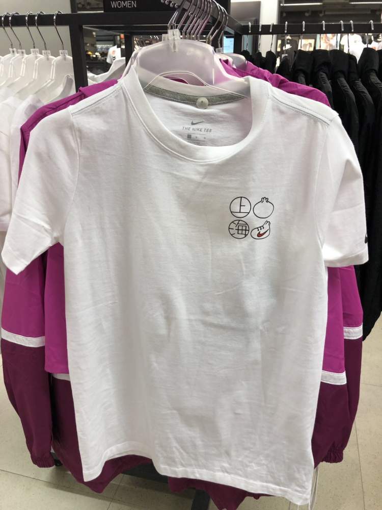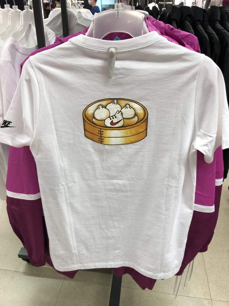 Nike的T恤几乎都是149元、169元这样的价格,且全场鞋、服、包2件8折,3件以上7折。看这款颇具海派特色的小笼包T恤,正面是上海两个字加两个小笼包,其中一个小笼包被捏成了萌萌的运动鞋样子,上面还有Nike的经典勾子,背后是四个“躺”笼屉里的小笼,同样有一个萌萌的运动鞋款小笼包,售价169元。