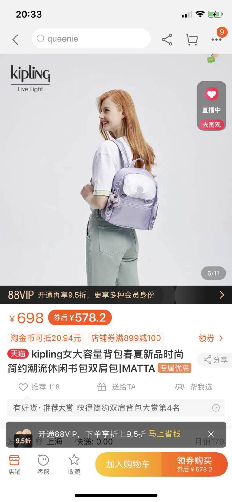 比如这款粉色水桶包,原价1090,折后价545元,关键还可以参加满减活动——5元、10元两档团券活动,5元可团88元满500可立减,10元可团188元满1000元立减,算下来,真的不要太划算。