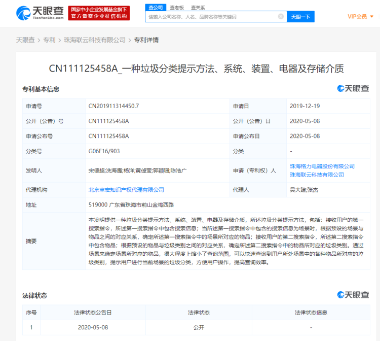 天眼查专利数据显示,5月8日,珠海格力电器股份有限公司和其全资子公司珠海联云科技有限公司公开了一项专利,即一种垃圾分类提示方法、系统、装置、电器及存储介质,专利申请日期为2019年12月。