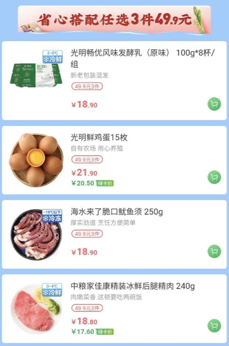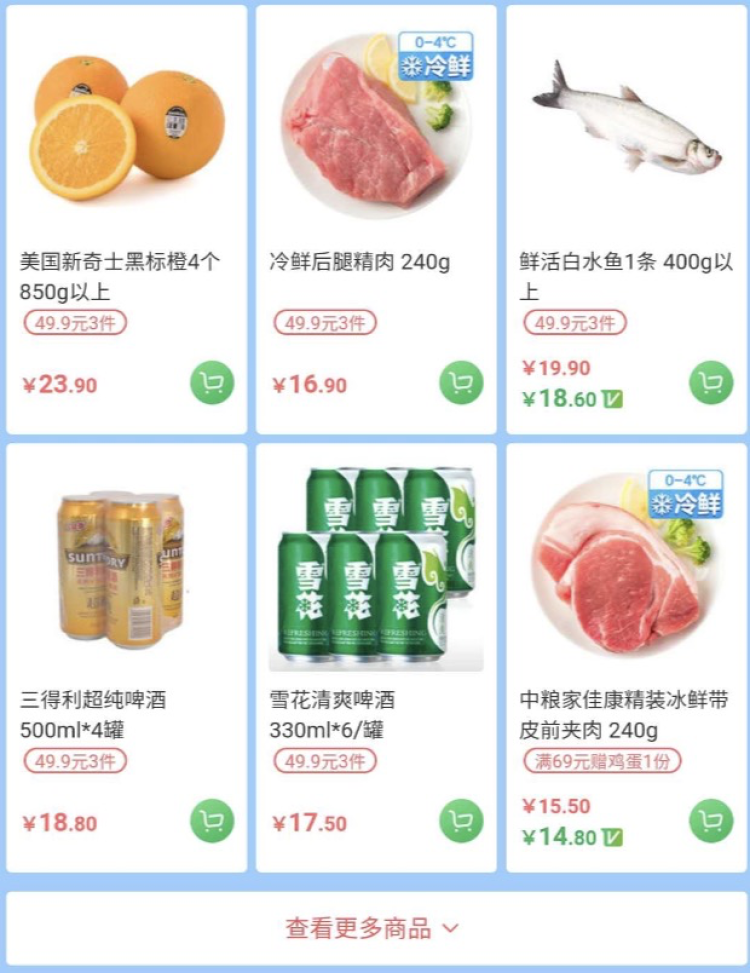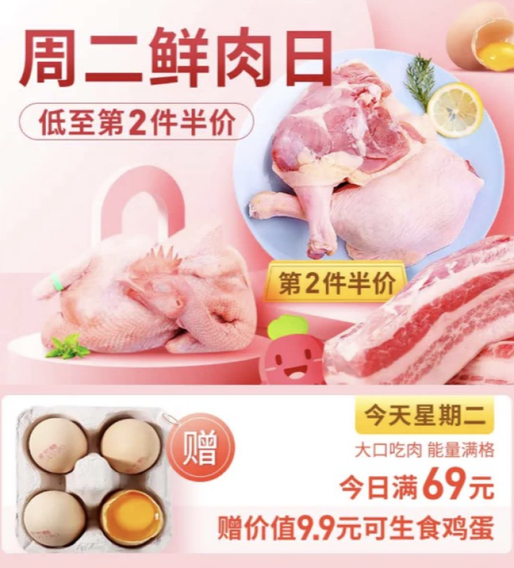 周二鲜肉日,低至第2件半价。今日满69元赠价值9.9元可生食鸡蛋。