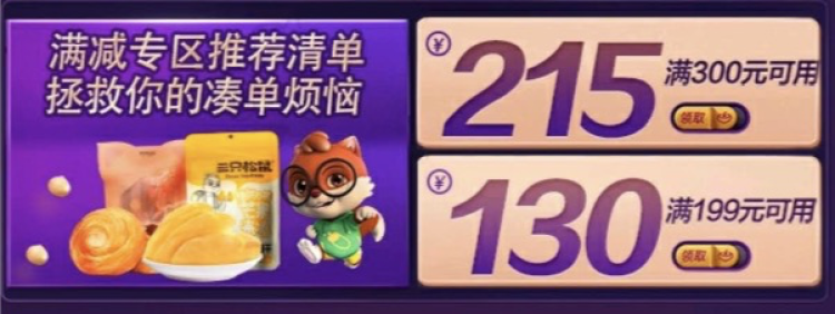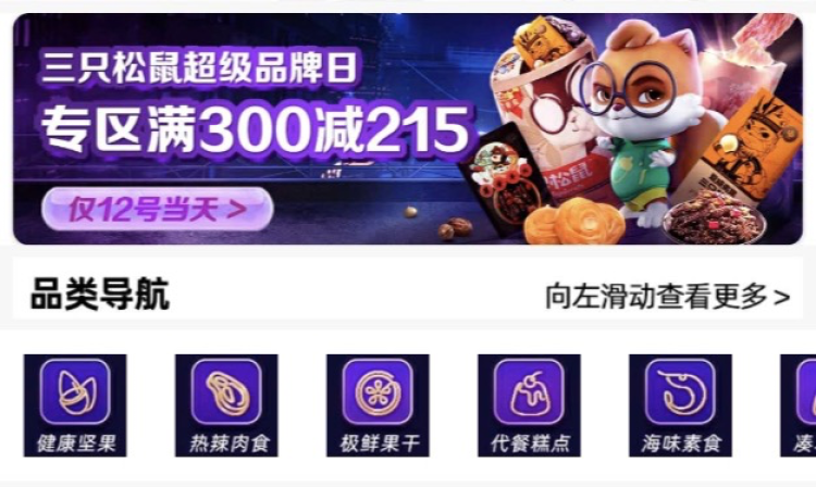 比如开屏就是三只松鼠超级品牌日,专区买300减215元,仅限今天。