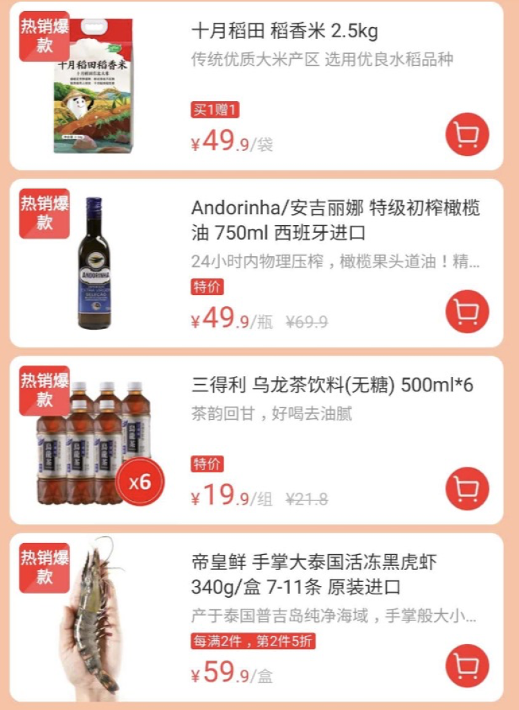 目前,许多热销食品有着买1赠1、第二件5折、特价等优惠。