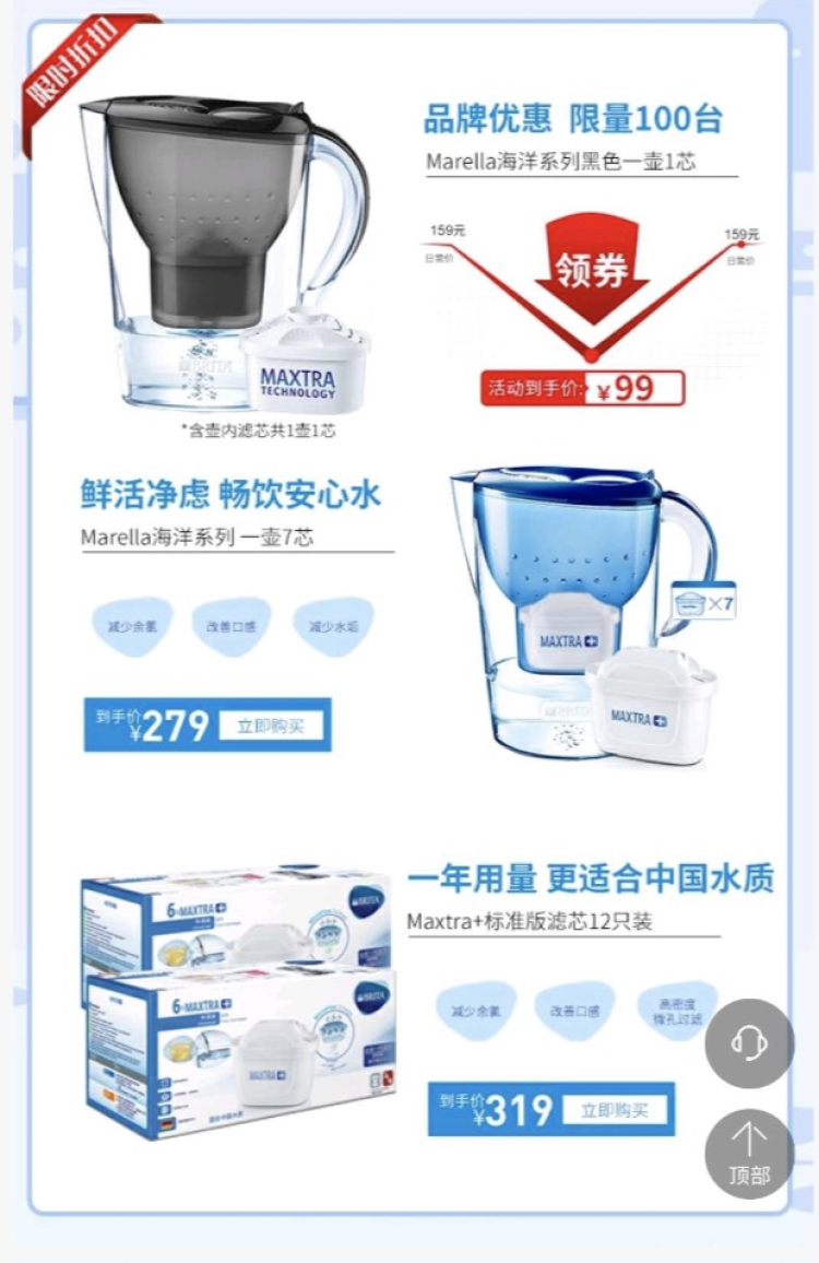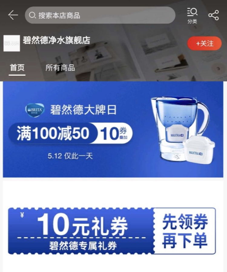 碧然德净水旗舰店的产品,满100减50还能叠加使用10元券,仅限今天。