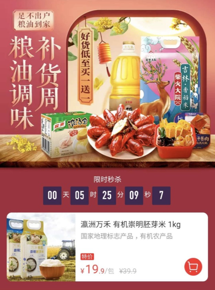 粮油调味补货周,低至买1送1。限时秒杀,瀛洲万禾有机崇明胚芽米,原价39.9元,特价19.9元。