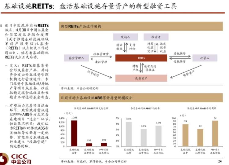 4月30日,证监会、发改委发布了《关于推进基础设施领域不动产投资信托基金(REITs)试点相关工作的通知》,标志着境内基础设施领域公募REITs试点正式起步。基础设施REITs作为一种权益性工具,通过盘活存量资产改善基建企业的现金流和资产负债率,提高资产周转率,从而优化基建的商业模式。