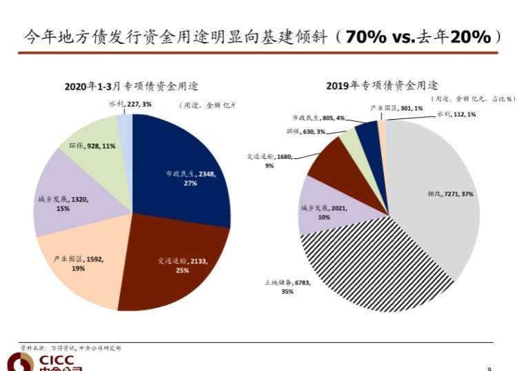 中金研究部首席中国宏观经济分析师易峘指出,今年地方专项债的资金用途上已经体现出加强城镇化相关基础设施建设的政策导向——今年 一季度的地方专项债净发行中,约7成的投向是市政民生、交通运输、产业园区这三个投资领域,而去年这三项合计仅占15%左右。